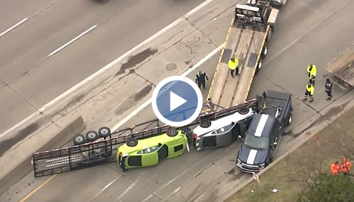 Шофьор на тежък пикап Ford F-350 с триосно ремарке, превозващо две чисто нови купета Mustang Shelby GT500, изгуби контрол над управлението и катастрофира в Детройт, съобщава WDIV.