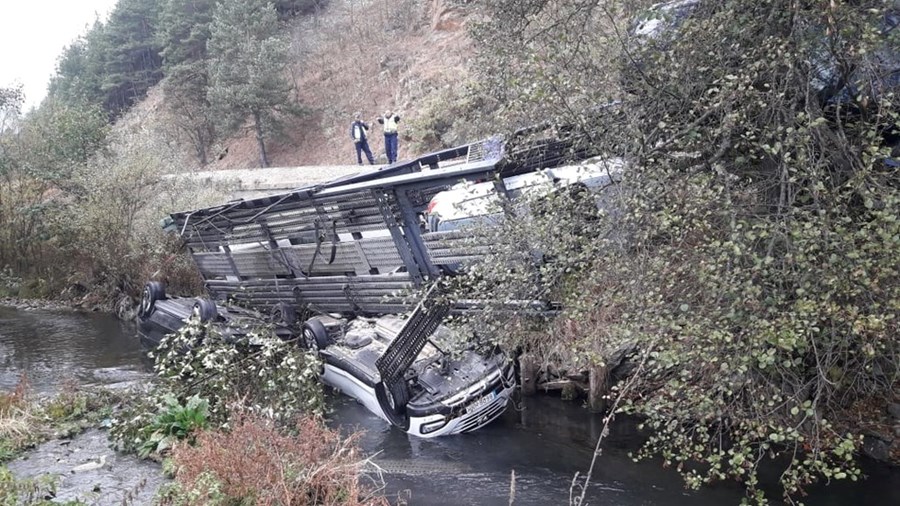 Водачът на товарния автомобил не е пострадал, но няколко от превозваните леки автомобили са паднали в реката.