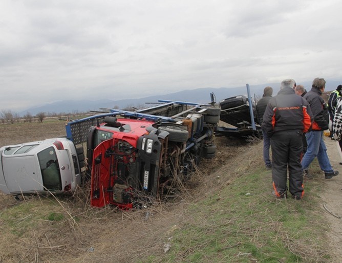 Автовозът, натоварен с четири автомобила, се е обърнал в канавката. В момента се изтеглят колите. Сигналът за инцидента е подаден към 11.35 часа. Причините засега са неизяснени, съобщават от ОДМВР - Пловдив.