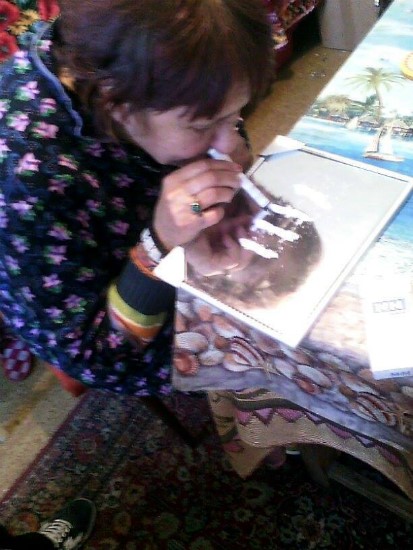 На едната бабата, която видимо изглежда да е поне около 65, е наредила три линии с бяло вещество (напомнящо кока) върху огледало и показва среден пръст.