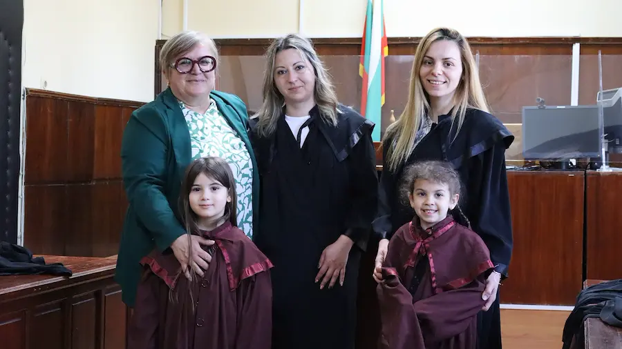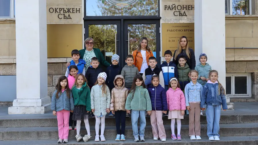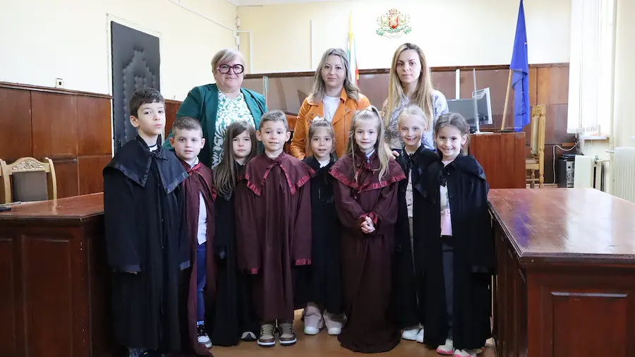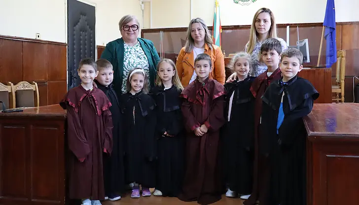По-късно децата влязоха в една от съдебните зали на институцията. Там те бяха посрещнати от съдия Доротея Иванова, която им обясни каква е ролята на магистратите и защо е важно правилата и законите в обществото да се спазват. По време на беседата бъдещите ученици получиха възможност да облекат истински тоги на съдии и прокурори.