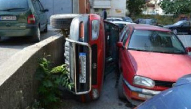 Обяснение как точно е успял да паркира по този начин има - докато давал назад, подпрял бордюра, пък дал газ и бум долу.