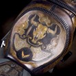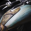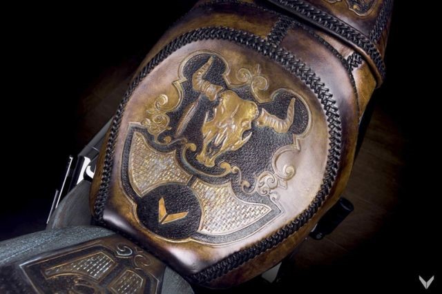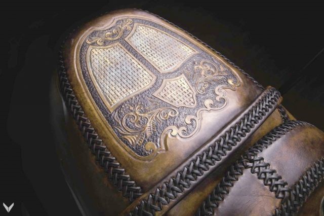 Патината обаче е едната нишка от художественото послание на мотоциклета. Кожените елементи изцяло разсейват всякакви съмнения относно истинността на творчеството. За целта са използвани първокласна телешка кожа, растително-дъбен телешки бланк, който е обработен на ръка до последния детайл, чрез традиционни сарашки техники.