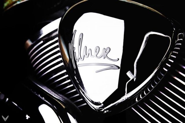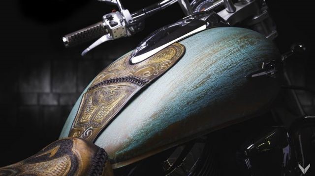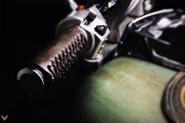 Старинното излъчване е подсилено с послание от черепа на бик извезан в кожата, и разбира се логото на Vilner. От същата кожа са изработени и ръкохватките, които са съшити с ремък. По този начин дизайнерското ателие Vilner категорично доказва, че мотоциклетът може да бъде превърнат в шедьовър на изкуството.