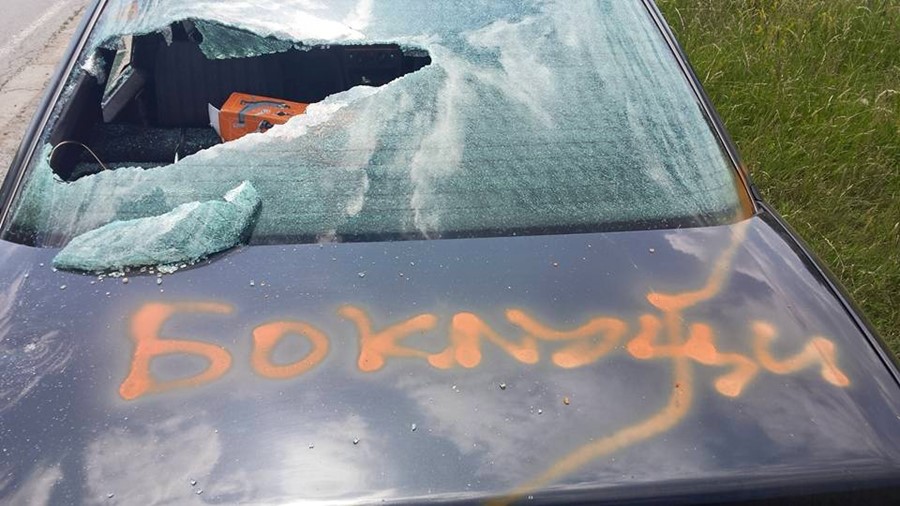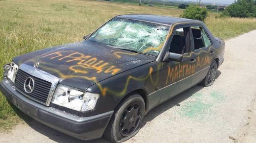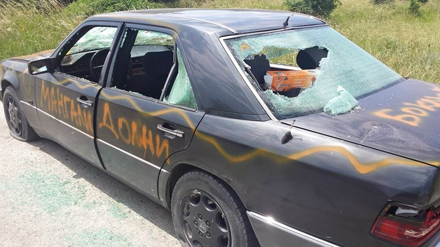Във Фейсбук се появиха и снимки на същата кола. Тя е изпотрошена и надраскана с надписи "боклуци", "крадци" и т.н.