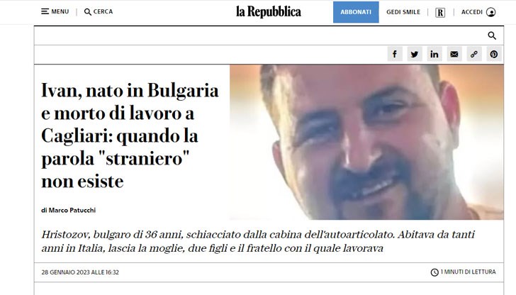 38-годишният Иван Христозов е загинал при трагичен инцидент на работното си място в Каляри, остров Сардиния, на 5 декември. Повече от месец и половина по-късно римският всекидневник „Република” му посвети статия, за да не остане историята му само като част от „баналната статистика”, пише вестник 24 часа.