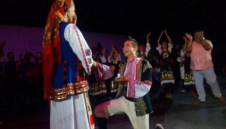 Танцьорът от ансамбъл „Пирин“ Михаил Аладжов прекъсна програмата на 44-ия международен фестивал за традиционна музика и танци в Монтоар Деласю, Франция, и пред близо трихилядната публика направи предложение за брак на приятелката си, певицата Славина Пулева.