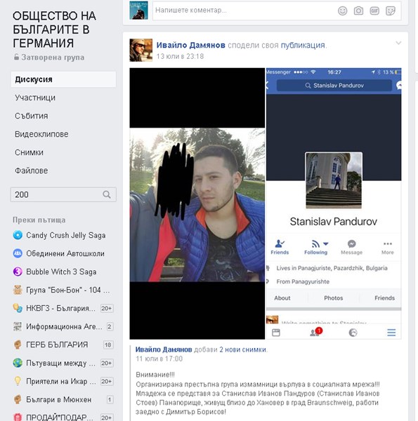 За схемата алармира човек, „изгорял“ със 160 евро, мислейки, че помага за изпадналия в беда българин Станислав. „Представя се за жертва на измамни работодатели в строителния бранш, казва, че е на улицата без пари и няма къде да спи! Когато му предложите най-малкото подслон, той споменава за друг негов приятел с кола, която се е развалила и започва да ви моли за пари в „утежнилата“ се ситуация“, разказва ужиленият Ивайло във Фейсбук групата „Общество на българите в Германия“, информира Монитор.