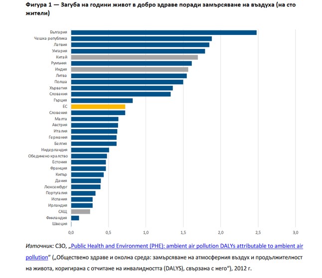 България е лидер по загубени години на живот в добро здраве заради мръсен въздух. Гражданите у нас скъсяват с 2.5 години времето, в което са здрави, докато средно за Европейския съюз този показател е 0.7 години. Шведите и финландците се радват на най-малко загубите години здраве заради замърсяване на въздуха.