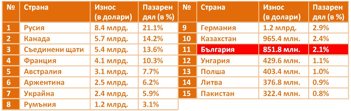 В стойностно изражение на посочените в таблицата 15 държави се пада 92.5% от световния износ на пшеница през миналата година. Най-бързо е нараснал експортът на хлебното зърно от Аржентина спрямо 2014 година (+300.7%). По този показател България е на 4-то място в света с ръст от 22.9%, като преди нас са: Русия (+55.5%) и Украйна (+31.1%).