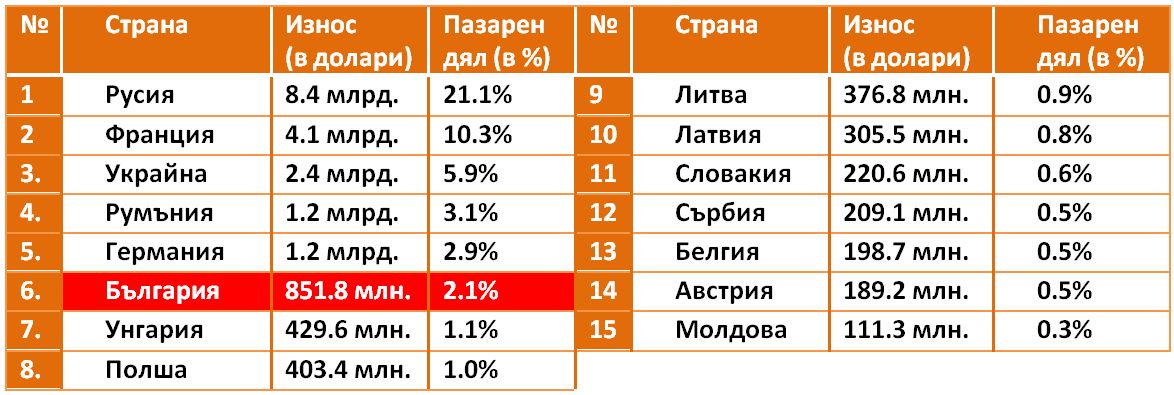 От таблицата по-горе е видно, че България е на 4-о място в ЕС и 6-то в Европа, но е изнесла почти два пъти повече хлебно зърно в стойностно изражение от следващите я в класацията Унгария и Полша, взети заедно.