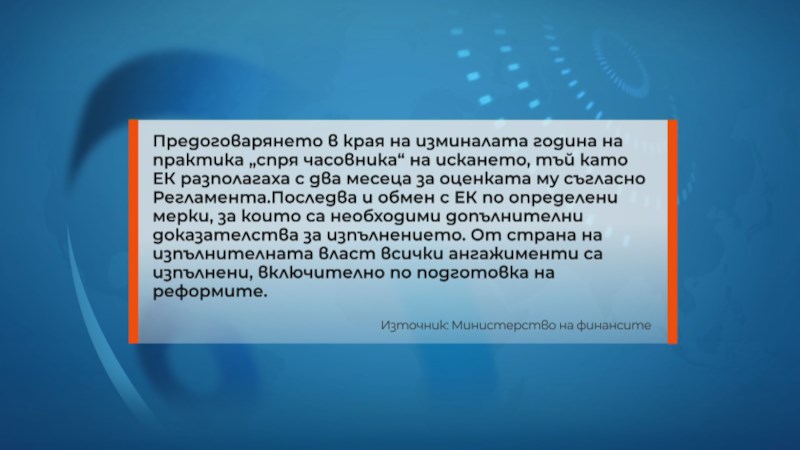 Министерство на финансите: "Предоговарянето в края на изминалата година на практика „спря часовника“ на искането, тъй като ЕК разполагаха с два месеца за оценката му съгласно регламента. Последва и обмен с ЕК по определени мерки, за които са необходими допълнителни доказателства за изпълнението. От страна на изпълнителната власт всички ангажименти са изпълнени, включително по подготовка на реформите."