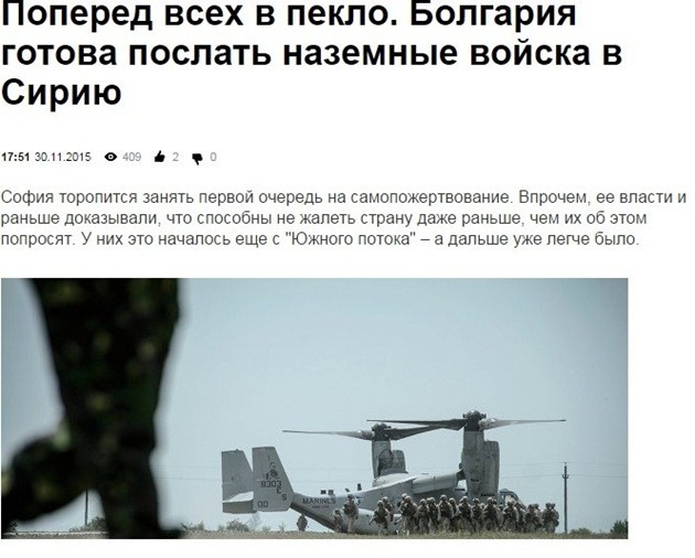 Само заради благодарността на Вашингтон София изяви желание да вземе участие в сухопътна операция срещу ИДИЛ. Други причини да направи това тя няма. От бежанци, разбира се, също страда, но не чак толкова, че да се хвърли пред дулата. Биха стигнали и хиляда военнослужещи на своята граница, в помощ на полицията, коментира руското издание.