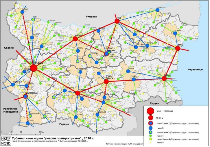 На национално равнище развитието на столицата като град от Мега европейско ниво е съчетано с успешно развитие на ограничен брой центрове от второ йерархично ниво с национално значение. Това са Варна, Пловдив, Бургас, Русе, Стара Загора и Плевен. Група средни градове показват потенциали да се присъединят към второ йерархично ниво – Видин, Враца, Габрово, Велико Търново, Шумен, Добрич, Сливен, Ямбол, Хасково, Пазарджик, Благоевград, Перник, Кюстендил. Целенасочената регионална политика следва да бъде насочена и да съдейства за развитието на Велико Търново и Благоевград с оглед на тяхното стратегическо местоположение в националната територия, като балансиращи развитието регионални центрове.