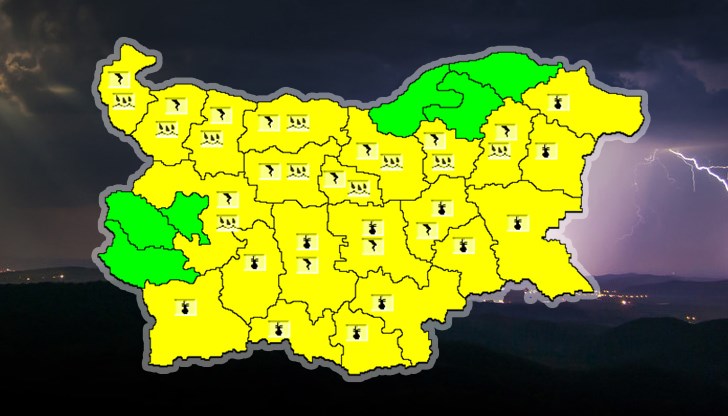НИМХ обяви жълт код за обилни валежи и гръмотевици в 13 области на страната.