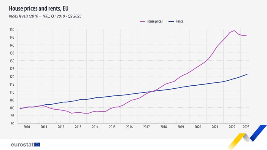Цените на жилищните имоти и наемите в Евросъюза следваха еднаква посока на развитие, нараствайки в унисон между 2010 г. и второто тримесечие на 2011 г. След това обаче цените на жилищата и наемите поеха по различни траектории: докато наемите отбелязаха стабилно увеличение до второто тримесечие на 2023 г., цените на жилищата се колебаеха значително.
