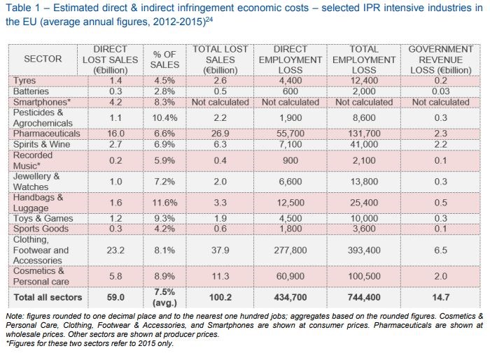Нови изследвания на Службата на Европейския съюз за интелектуална собственост (EUIPO) разкриват, че 60 милиарда евро се губят всяка година от фалшифициране в 13 икономически отрасъла. Натрупаните загуби са в размер на 116 евро на гражданин на ЕС годишно.