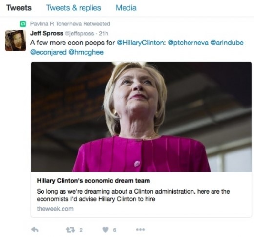 Авторът, който е кореспондентът по икономика и бизнес на "Уийк", подчертава, че няма представа дали препоръчаните от него икономисти ще получат предложение за работа от Клинтън ако тя стане президент, нито дали биха приели такова предложение, пише БТА.