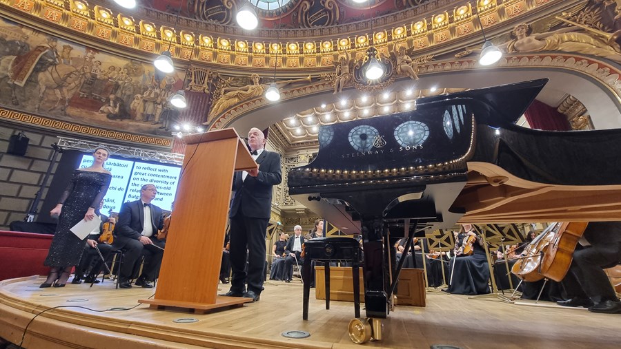 Дипломатът акцентира върху българския принос в историята на самата сграда, припомняйки, че Евлоги Георгиев през 1886 година дарява 200 000 леи в злато за изграждането на Атенеума. Посланикът обърна внимание и на друга българска следа в румънската столица - „Солаковият хан", който е бил седалище на революционната борба на българите и в различни периоди е бил обитаван от Васил Левски, Христо Ботев и Георги Раковски. Там се е помещавала и печатницата, където Любен Каравелов е издавал вестниците „Свобода" и „Независимост", както и списание „Знание".