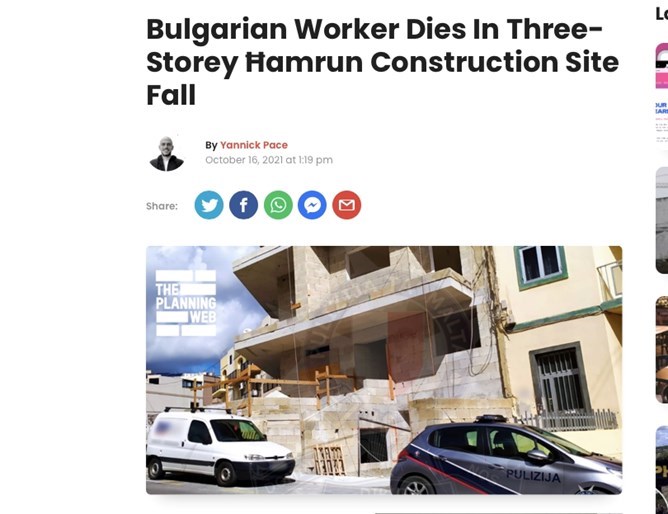 50-годишен български работник е загинал, след като е паднал от 3-етажна височина по време на работа на строителен обект в малтийския град Хамрун, съобщи "Lovin Malta", предава БГНЕС.