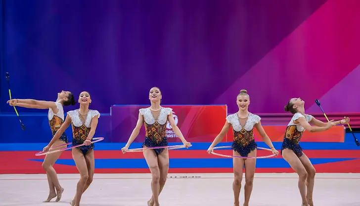 Българският ансамбъл по художествена гимнастика завърши на осмо място в крайното класиране за многобоя на Световната купа в Баку. Родните грации показаха характер и си осигуриха място на финала на съчетанието с три обръча и два чифта бухалки, постигайки втория по сила резултат в квалификацията и отстъпвайки единствено на състава на Израел.