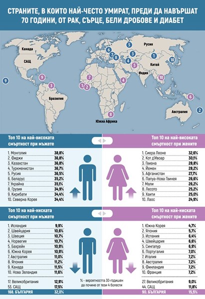 Монголия е страната с най-много смъртни случаи от такива заболявания при мъжете между 30 и 70 години, а Сиера Леоне – при жените. При мъжете тази смъртност е най-ниска в Исландия, а при жените – в Южна Корея.