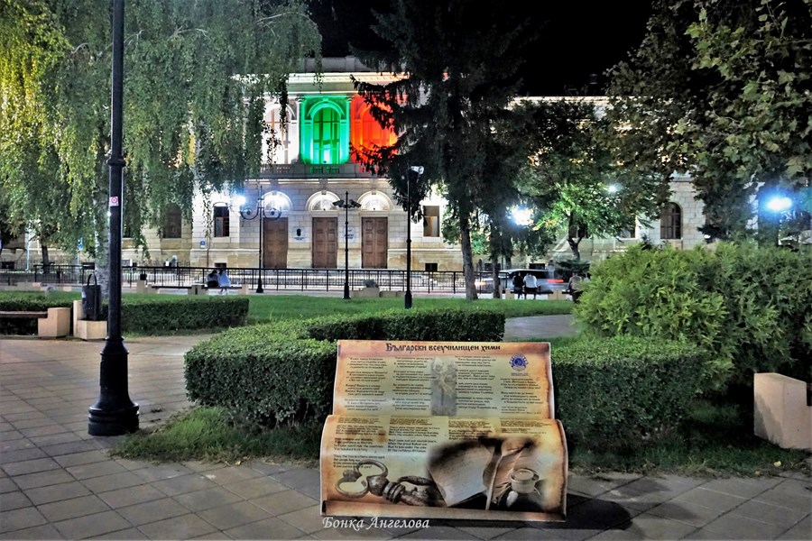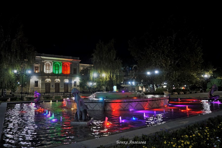 Сградата на гимназия "Христо Ботев" грейна в националния трикольор. Бившият дворец на Батенберг на едноименния площад бе осветен снощи, заедно с пускането на художественото осветление на градинката и фонтана.