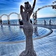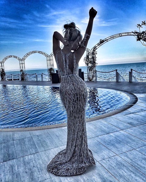Високият колан на роклята подчертаваше талията й, а дължината й бе до земята. Косата на разтропаната рапърка бе прибрана, а бижутата по ръцете – решени в сребро, така че да отиват на дрехата. На едната ръка тя имаше масивна гривна с над 1000 камъка „Сваровски“. Палавницата, станала известна с хита си за „яката дупара“, публикува кратко видео в инстаграм, в което представи визията си с думите „Бал или какво?“.