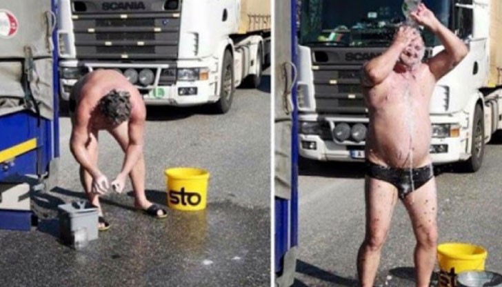 Снимката на нашенеца, който се сапунисва и полива с вода пред камиона си по гащи, обиколи гръцките медии.