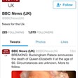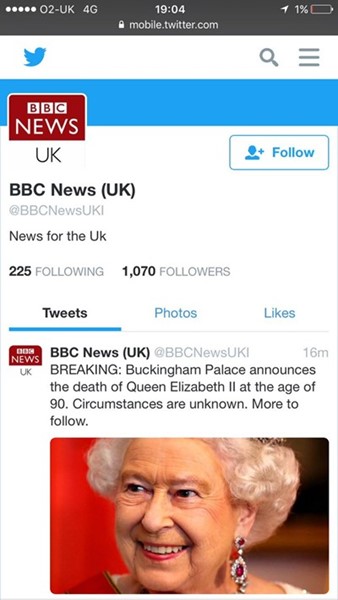 В туитър профила си БиБиСи разпространи новината, че кралица Елизабет II е починала.