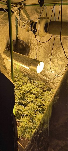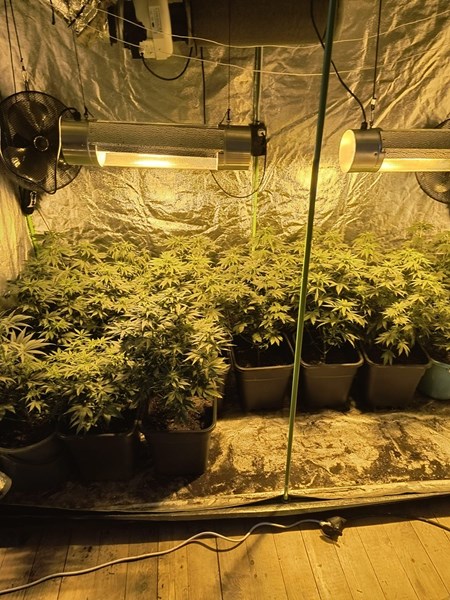 При претърсването в първото жилище служителите на реда открили специално пригодено помещение с палатка, оборудвана с вентилационна, осветителна и отоплителна система. В нея се отглеждали 21 саксии с канабисови растения, високи между 60 и 70 сантиметра. Намерени са и множество торове, препарати и специална почва за растежа им.