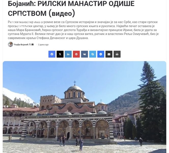 „След битката при Велбъжд през 1330 г., водена от сръбския генерал Стефан Дечански, Рилският манастир става част от сръбската държава“, пише Боянич на своя уебсайт.