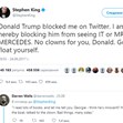Стивън Кинг блокира Доналд Тръмп, за да не гледа предстоящия филм "То" и сериала "Господин Мерцедес", които са по негови книги, съобщи Асошиейтед прес, цитирани от БТВ.