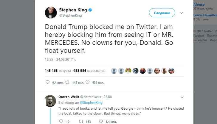 "Без клоуни за теб, Доналд. Хвърли се в сам в пространството" - написа Стивън Кинг в „Туитър”. Реакцията на писателя е предизвикана от факта, че Доналд Тръмп го блокира в „Туитър”.