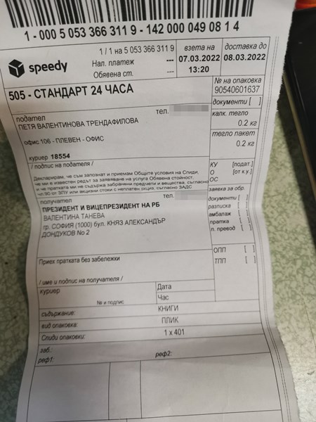 В конкретния случай исках да изпратя книги за Президента Радев и Вицепрезидента Илияна Йотова по случай 3ти март, които ми се връщат обратно , а на всичко отгоре трябва да платя и пари, защото пратката ми е върната.