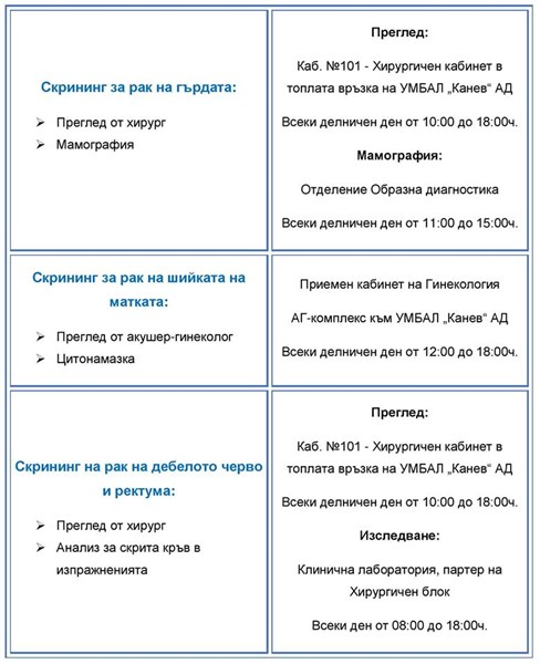 Във връзка с изпълнение на „Национална програма за превенция на хронични и незаразни болести“ 2014-2020г. Университетска болница „Канев“ обявява безплатен скрининг на три вида онкологични заболявания – рак на гърдата, рак на шийката на матката и рак на дебелото черво и ректума.