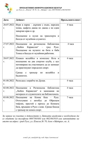 Лятна академия организира и екипът на Превантивно-информационния център. Тази година фокусът на организаторите е децата и младежите да придобият умения за планиране на цели както в краткосрочен, така и в дългосрочен план, като организират посещения на място и наблюдение на работата на различни професии. Предвидени са още спортни занимания, с които да се стимулира креативното мислене и избор на полезни дейности в свободното време. В планираните дейности са и посещения в музеи, при които участниците ще се запознаят с интересни моменти от историята на родния край.