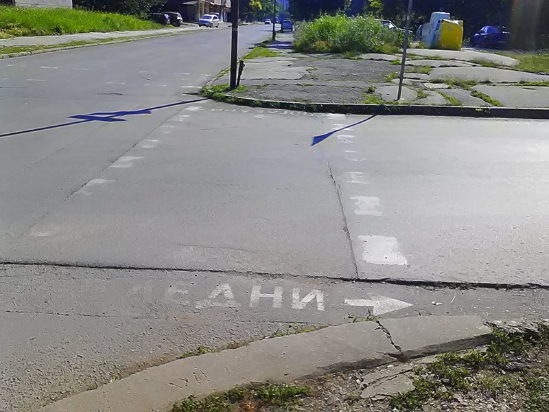 Така изглежда маркировката на кръстовището на улица "Рига" и улица "Братислава" в град Русе.