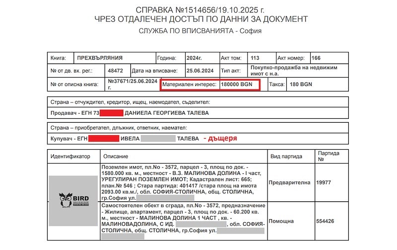 "Очевидно е, че сделката е симулативна, но както самата Талева преценява в един от отказите да разследва странните имотни сделки на Сарафов, това не е проблем между роднини", пише BIRD.bg.