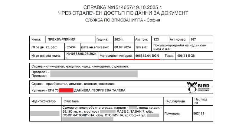 Парите били инвестирани в апартамент в центъра на София - 56 квадратни метра за 406 812 лева или 3 700 евро на квадратен метър, твърди BIRD.bg.