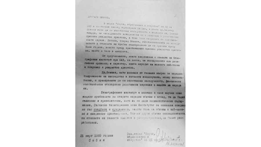 “Етнографският институт е включил в своя научен план изцяло проблемите за старите народни обичаи, с оглед те да бъдат съживени и преосмислени, като им се даде социалистическо съдържание, пише в отговора, който е подписан и от зав. отдел “Наука, образование и изкуство” на ЦК на БКП Рубен Аврамов. - Съгласно тазгодишния план