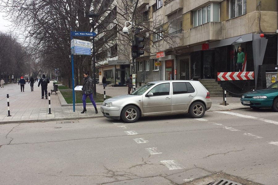 Този случай наистина надминава всяка наглост, на която сме се натъквали до сега. Шофьорът на автомобила не само е паркирал на кръстовище пред светофара, но и се е настанил точно на пешеходната пътека.