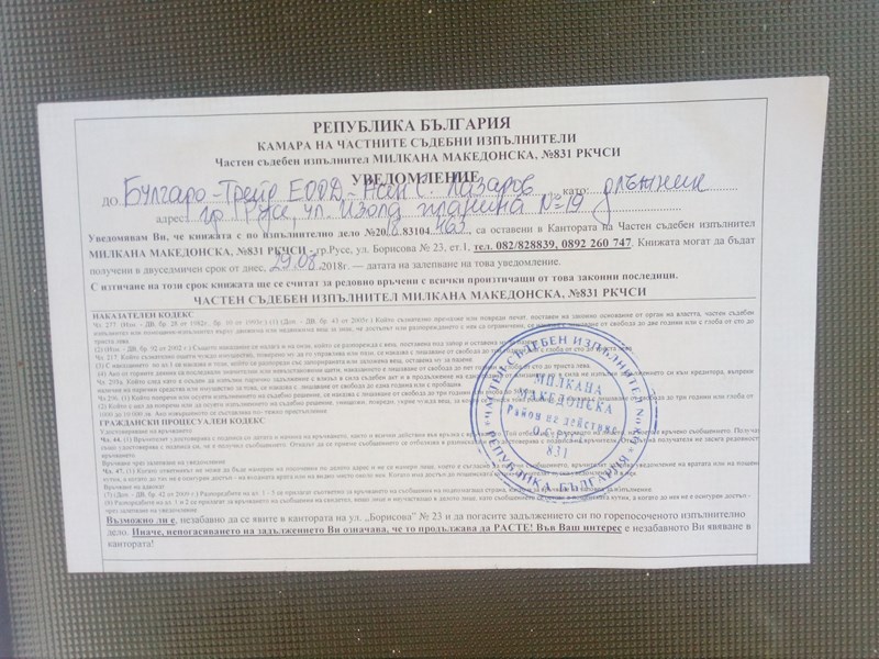 В момента на отключената входна врата е залепено съобщение, с което се уведомява длъжникът /Булгаро Трейд ЕООД/, че книжата по заведено изпълнително дело са в кантората на частен съдебен изпълнител и ако не бъдат потърсени в срок, "ще се считат за връчени с всички произтичащи от това законни последици."