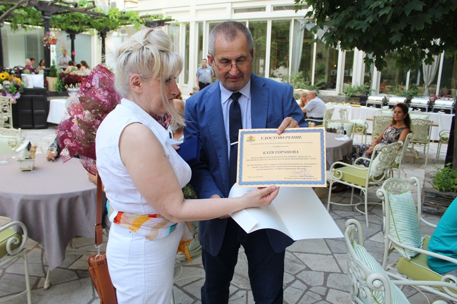 Доц. д-р Стефко Бурджиев – областен управител на Област Русе, уважи празника и поднесе поздравителен адрес и специален плакет на Катя Горанова – изпълнителен директор на БЦПМСП, с което отбеляза нейният принос към развитието на малките и средни предприятия, икономическото развитие и просперитета на Русе и Русенска област.