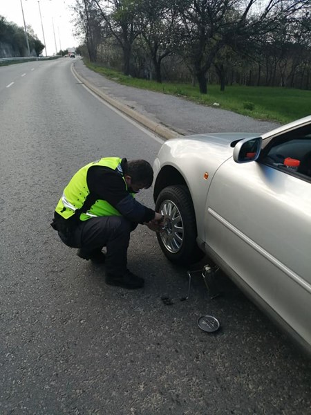 Служителят на ОД на МВР - Перник е сменил спуканата гума на автомобила на г-жа Генадиева.