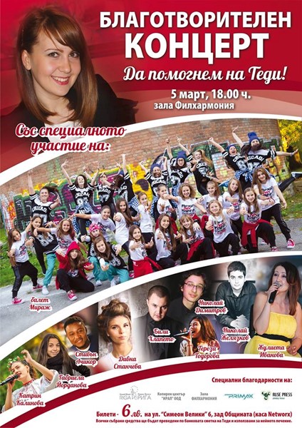 Участие в каузата за събиране на средства за лечението на Теди ще вземат Габриела Йорданова, Тереза Тодорова, Николай Желязков /пиано/, балет "Мираж", Катрин Калинова, Стивън Ачикор / X factor/, Дивна, Били Хлапето, Николай Димитров /пиано/, Жулиета Иванова.