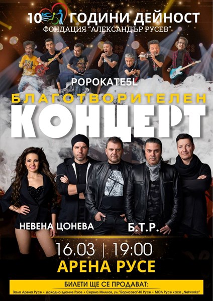 ПоПоКАТЕ5л, Невена Цонева и Б.Т.Р. подкрепят благородната кауза на Фондация „Александър Русев“ и ще бъдат в Русе за голям и зрелищен концерт на 16 март 2024 г. в Зала Арена Русе. С музика и много настроение ще бъдат отбелязани 10 години от началото на дейността на Фондацията и в частност на човека, който стои с името и труда си зад развитието на стотици деца във водата – Илиян Русев Скури.
