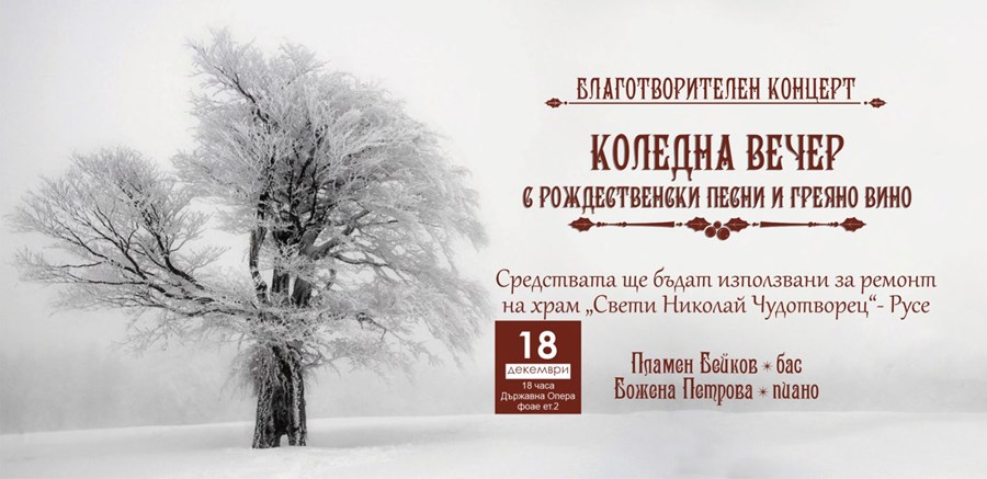 Благотворителен концерт под надслов "Коледна вечер" ще събере русенци в подкрепа на една значима кауза – ремонта на храм "Свети Николай Чудотворец" в града. Събитието ще се проведе на 18 декември от 18:00 часа във фоайето на втория етаж на Държавна опера – Русе, съобщиха организаторите.