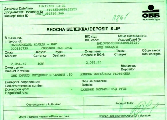 Сумата е преведена по сметката на „Българската Коледа“ с вносна бележка от 20.12.2018 г.