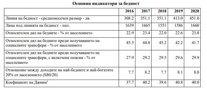 През 2020 г. линията на бедност общо за страната e 451 лева средномесечно на човек. При този размер на линията под прага на бедност са били 1,659 мил. души, или 23.8% от населението на страната.
